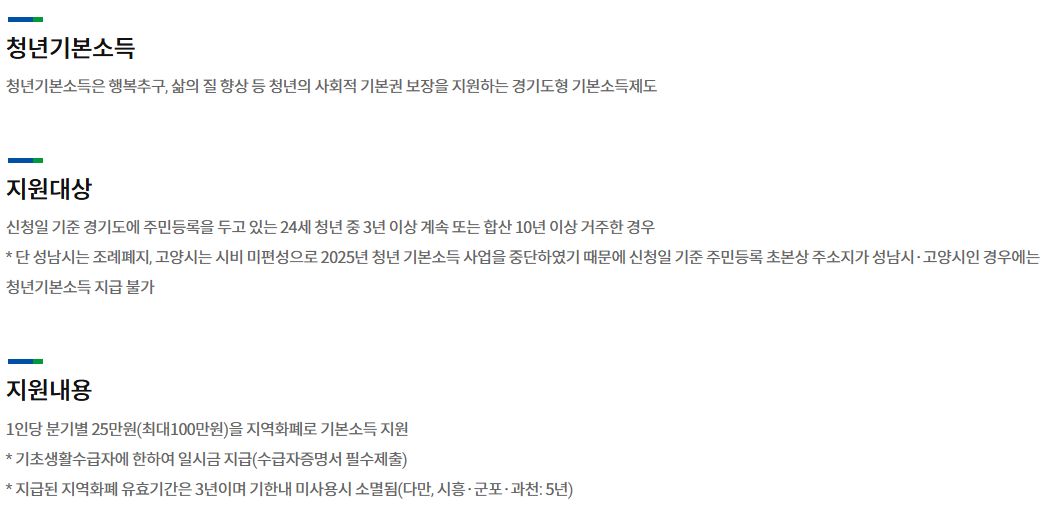 청년기본소득은 만 24세 경기도 거주 청년에게 분기별로 25만원씩, 1년 동안 총 100만원을 지급하는 제도입니다.