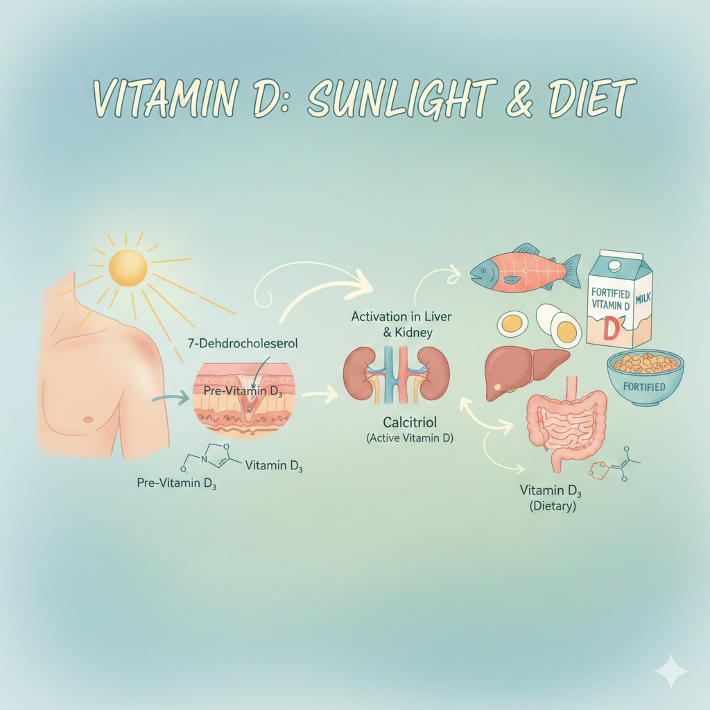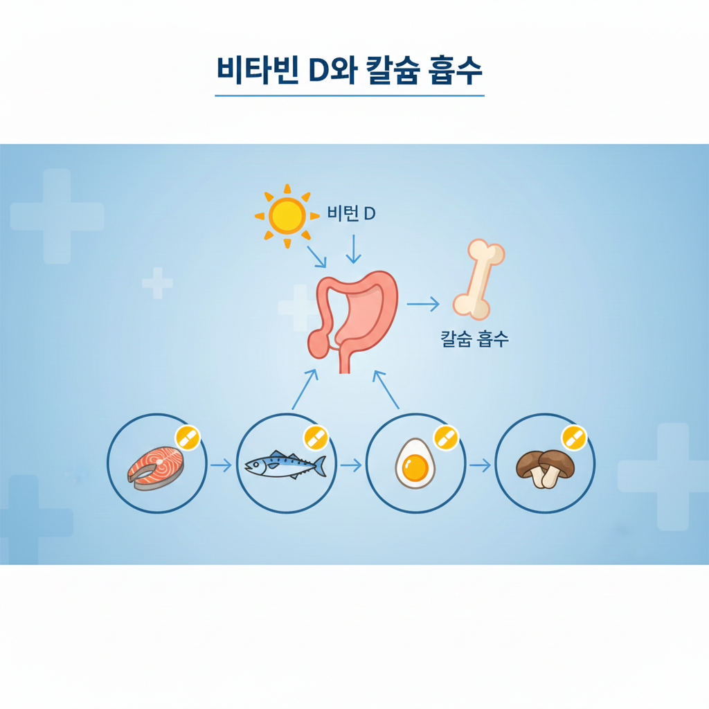 비타민 D는 칼슘이 몸에 잘 흡수될 수 있도록 도와주는 역할을 합니다. 햇볕을 쬐는 것만으로도 합성이 가능하지만, 음식으로도 어느 정도 보충할 수 있어요.