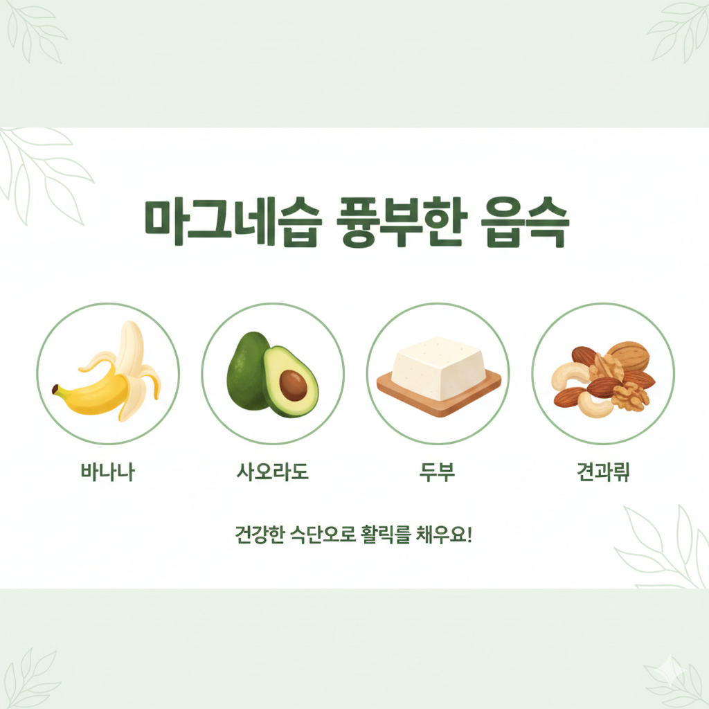 바나나, 아보카도, 두부, 견과류 등에 마그네슘이 풍부하게 들어있어요. 견과류는 하루 한 줌 정도, 바나나는 아침에 챙겨 먹으면 부담 없이 섭취할 수 있답니다.