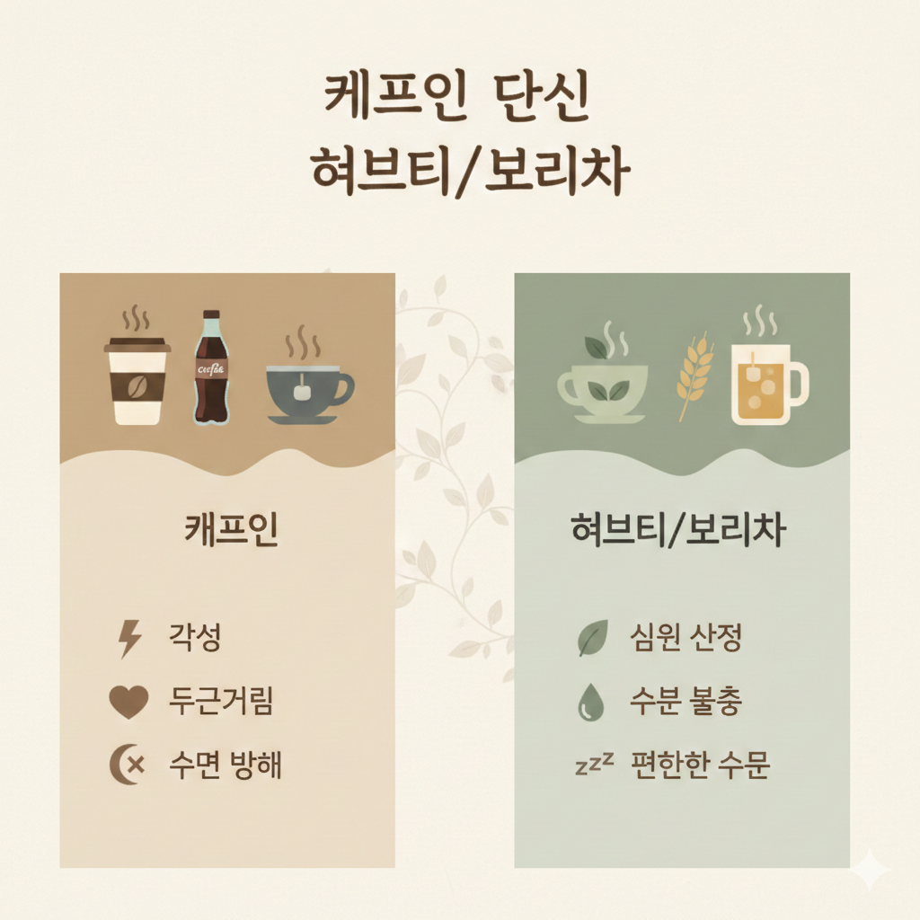 특히 카페인은 이뇨 작용을 일으켜 수분 부족을 유발할 수 있으니 주의해야 해요. 대신 허브티나 보리차 같은 무카페인 음료로 대체해보세요.