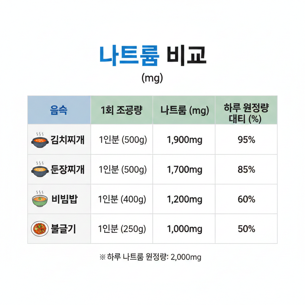 | 김치찌개 | 약 1800mg | 된장국+두부 |