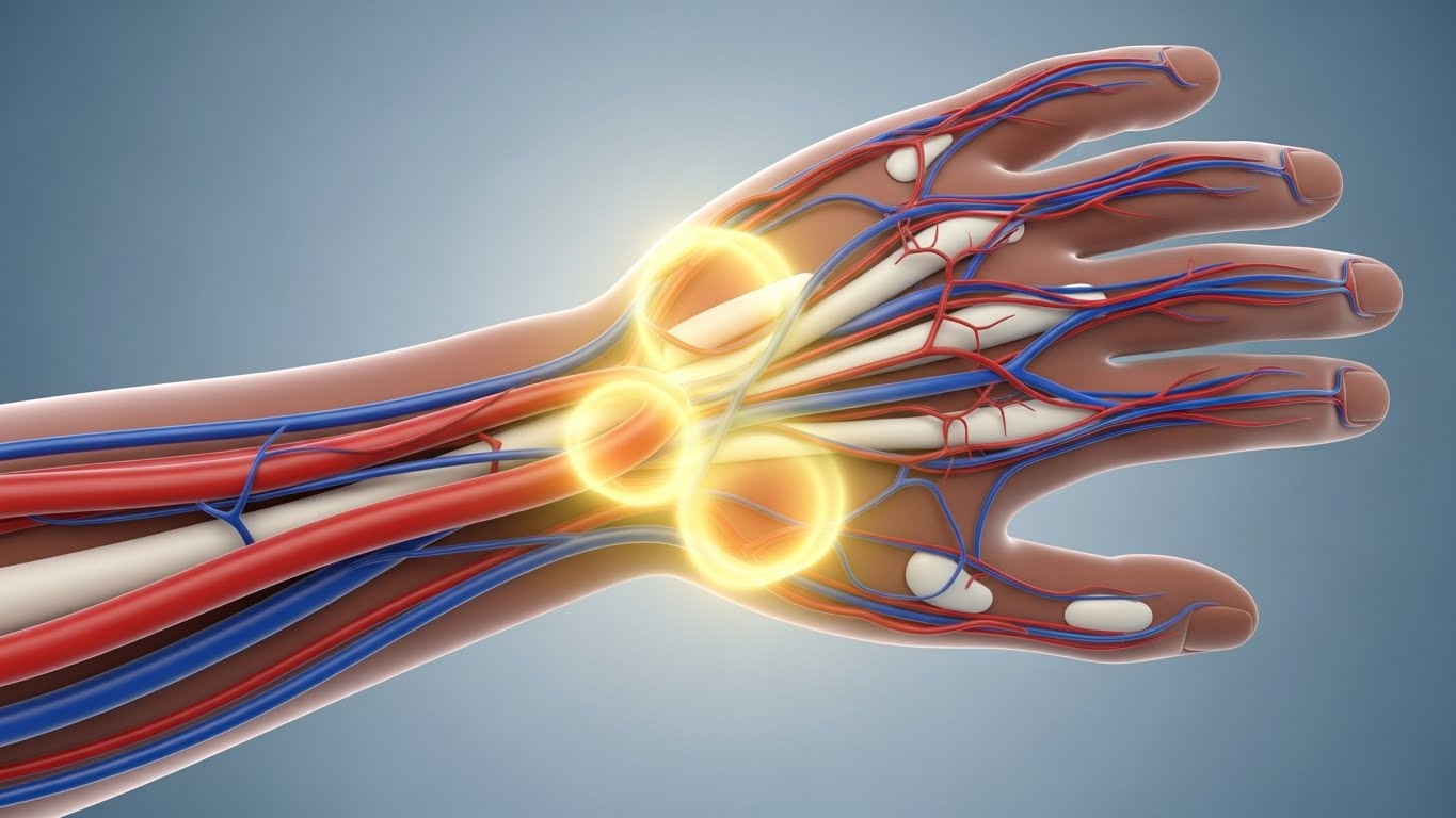 손바닥과 손가락 끝이 저리고, 아침에 손이 붓고 감각이 둔하다면 손목터널증후군의 가능성도 있습니다.