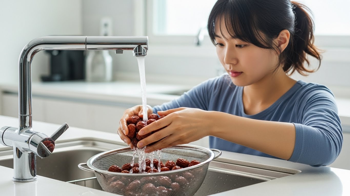 - 손질: 대추를 흐르는 물에 씻고 씨를 제거하거나 반으로 잘라 준비합니다. 생강을 쓸 경우 얇게 저며 둡니다.