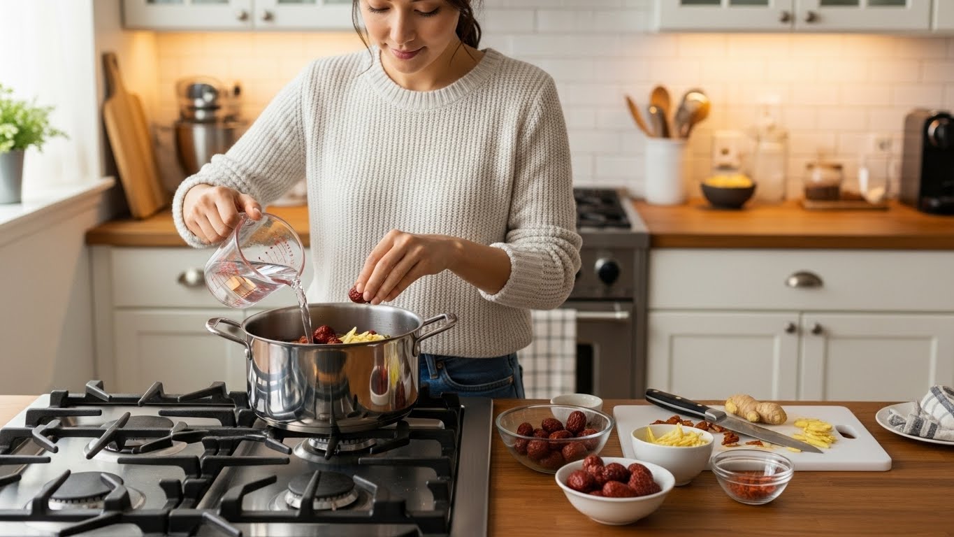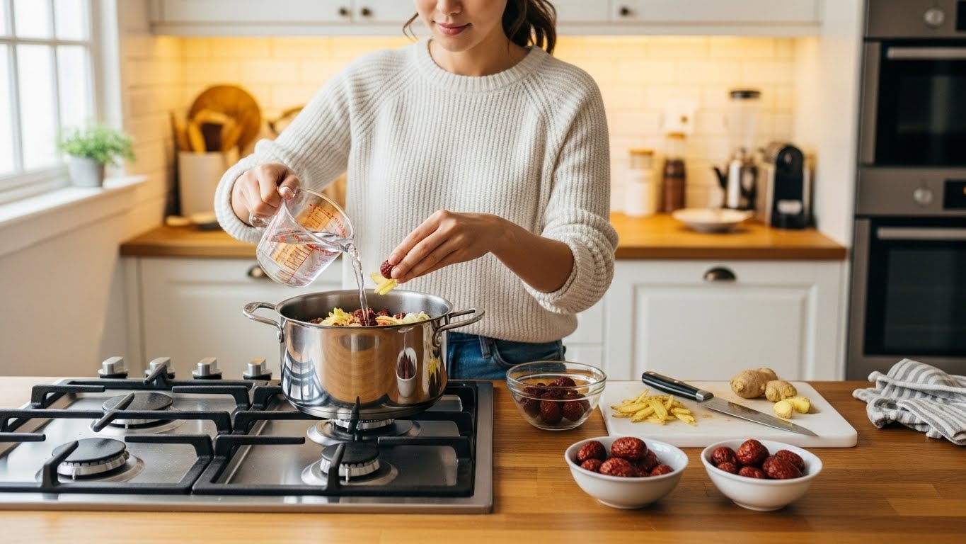 - 대추생강차(감기 예방형): 생강을 30~40g 넣고 30분 이상 약불에서 오래 끓이면 따뜻하고 매콤한 맛이 살아납니다. 감기 기운이 있을 때 좋습니다.