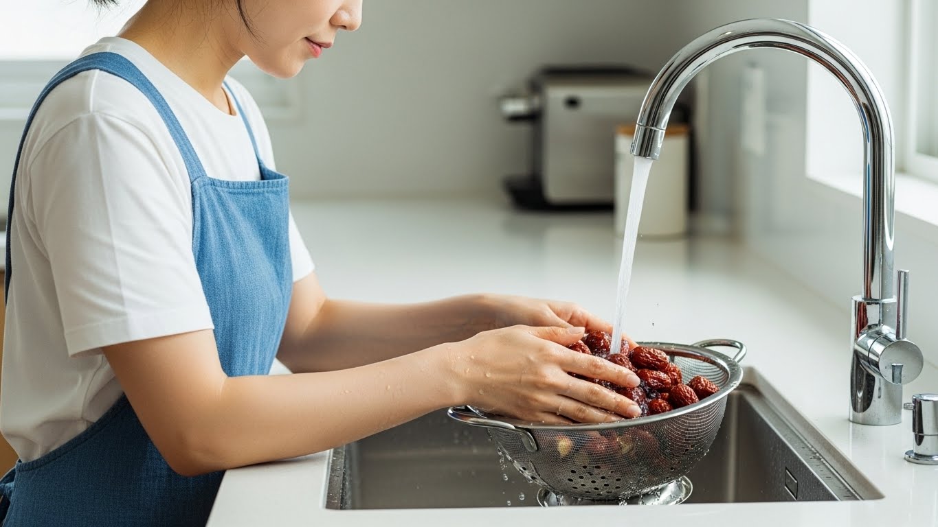 - 손질: 대추를 흐르는 물에 씻고 씨를 제거하거나 반으로 잘라 준비합니다. 생강을 쓸 경우 얇게 저며 둡니다.