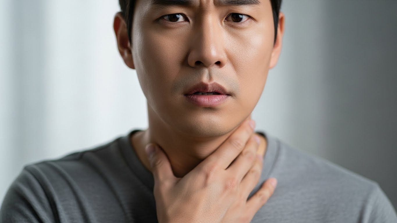 역류성 식도염이 있으면 목에 무언가 걸린 듯한 이물감이 느껴질 수 있습니다.